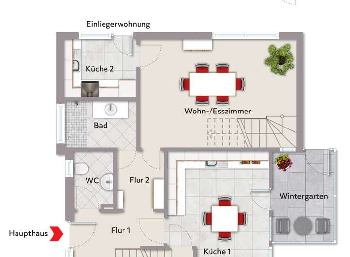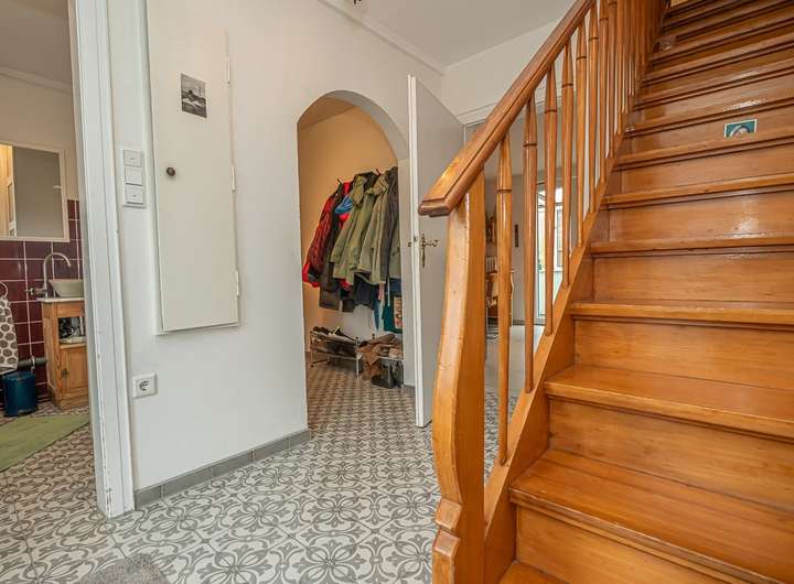 Das Haupthaus verfügt im Erdgeschoss über einen einladenden Flur, eine Wohnküche, ein Wohnzimmer, ein Badezimmer, ein Gäste-WC sowie einen kleinen Wintergarten, der zum Verweilen einlädt.