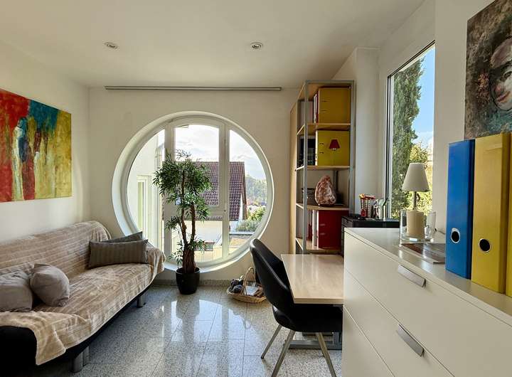 Im Erdgeschoss befindet sich neben dem Wohn- und Essbereich zudem ein Büro sowie ein Gäste-WC. Im Obergeschoss erwarten Sie zwei großzügige Schlafzimmer, ein begehbarer Kleiderschrank sowie ein Tageslichtbad mit Badewanne und Dusche. Von den beiden Schlafzimmern aus erreichen Sie die zwei Balkone.