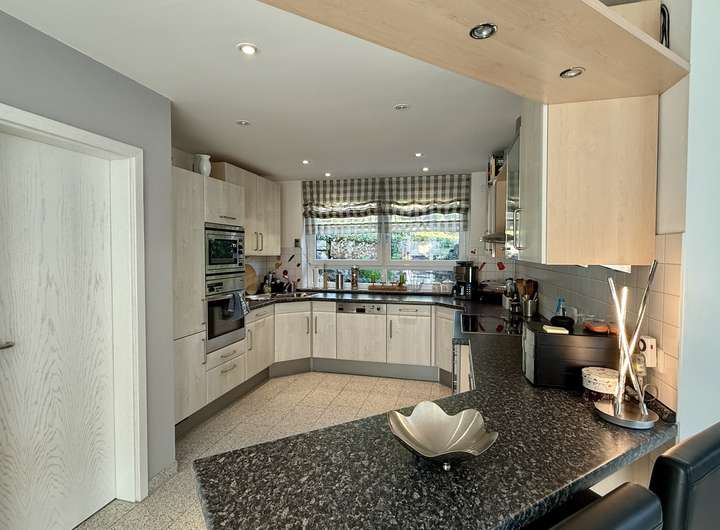 Bereits beim Betreten des ca. 2000 erbauten Hauses spürt man die besondere Atmosphäre, der großzügige, offen gestaltete Wohnbereich überzeugt mit einer modernen Raumaufteilung, einem offenen Kamin und großen Fensterfronten, die viel Licht hereinlassen und den Blick in den liebevoll angelegten Garten freigeben. Die offene Küche fügt sich harmonisch in das Wohnkonzept ein und verfügt über eine separate Speisekammer. Vom Wohn- und Essbereich gelangen Sie auf die große, umlaufende Terrasse, die zahlreiche Rückzugsorte und sonnige Plätze bietet ideal zum Entspannen und Genießen.