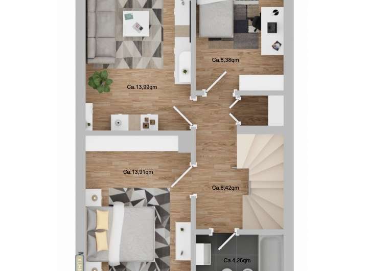 Die Holztreppe führt Sie in das 1. Obergeschoss, wo Ihnen drei Zimmer zum Schlafen, Arbeiten oder als Kinderzimmer zur Verfügung stehen. Das Bad mit einer Badewanne, Bidet und WC runden das Angebot auf dieser Etage ab. Über die zwei Kinderzimmer gelangt man auf den großzügigen Balkon, welcher im Sommer zum Verweilen einlädt.