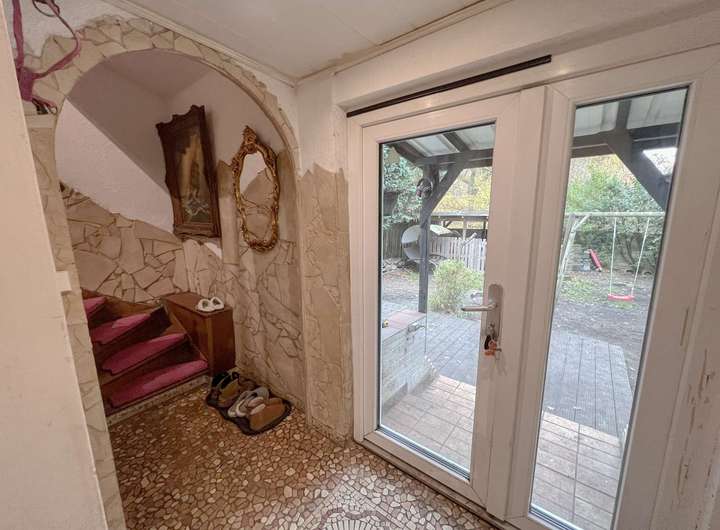Der Außenbereich ist derzeit funktional gehalten und bietet viel Raum für kreative Gestaltungsideen und persönliche Akzente.