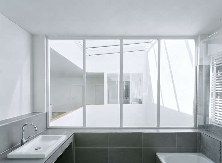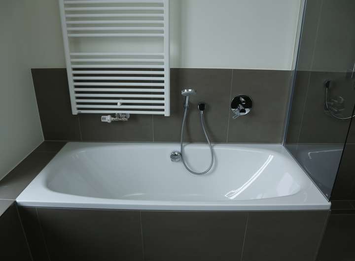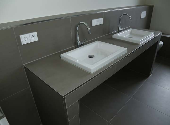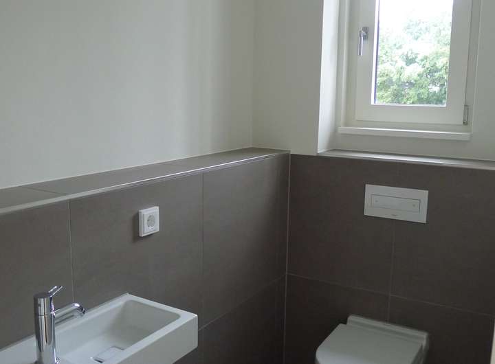 In Bad und WC sind hochwertige Feinsteinzeugfliesen von Mosa im Großformat 60 x 60 aus der Serie Greys verlegt.