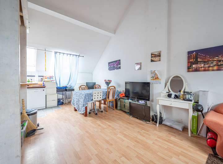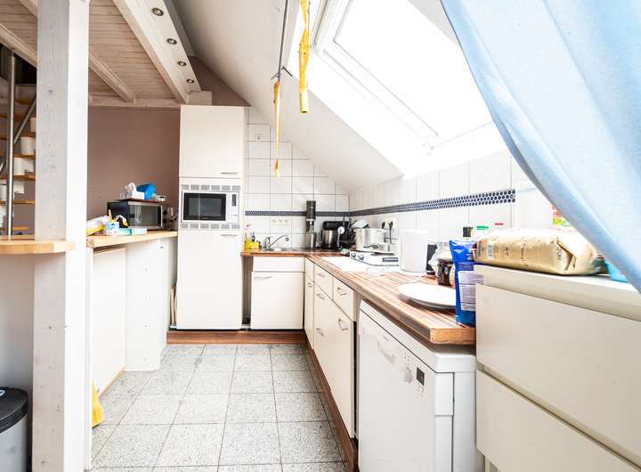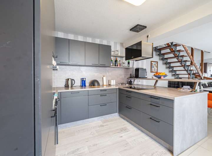 Wohnung 2 betreten Sie über eine kompakte Diele im Erdgeschoss. Im Obergeschoss öffnet sich ein heller Wohn-Küchenbereich, ergänzt durch ein Badezimmer und ein gut geschnittenes Schlafzimmer. Eine funktionale, charmante Einheit – perfekt für Singles oder Paare.