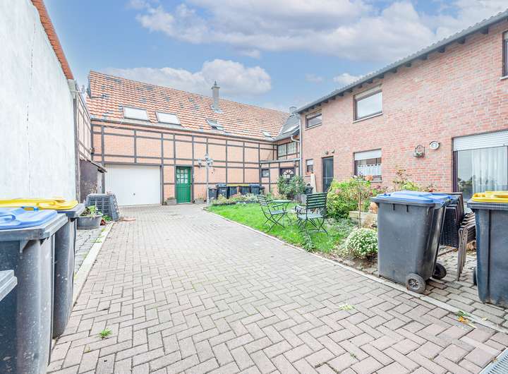 Beim Betreten des Grundstücks fällt sofort der geschützte Innenhof ins Auge – ein Ort, der sowohl Ruhe bietet als auch Begegnungen möglich macht. Die massive Bauweise, die klare Struktur und die liebevoll arrangierte Hofgestaltung unterstreichen den wertbeständigen Charakter des Hauses.