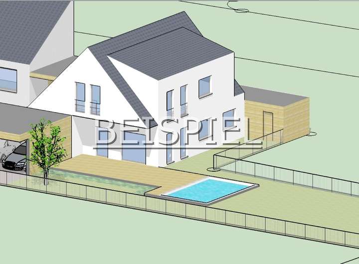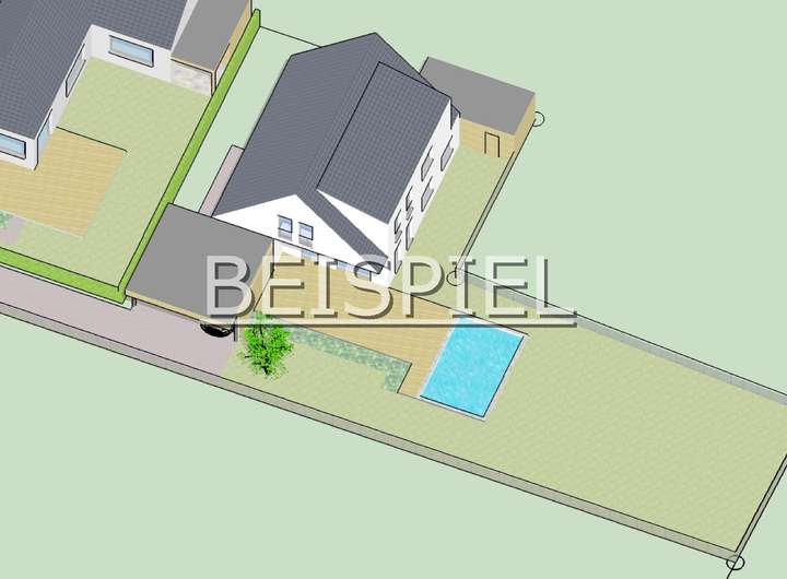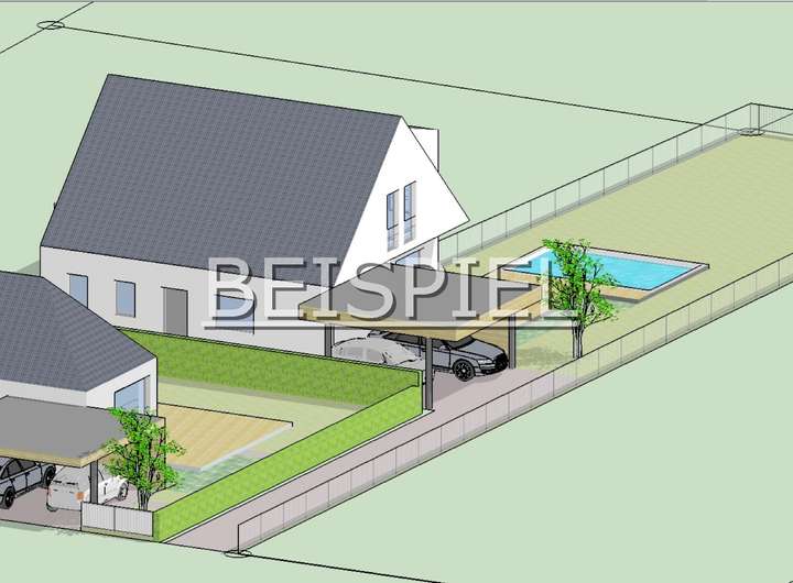 Unser Beispiel hat ca. 130 m² Wohnfläche, einen Carport von 6x6 m, eine Terrasse von 40 m² und einen Pool von 4x6 m. Als Garten Richtung Süden bleiben dann noch ca. 300 m².