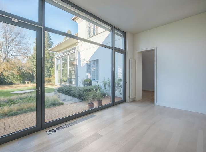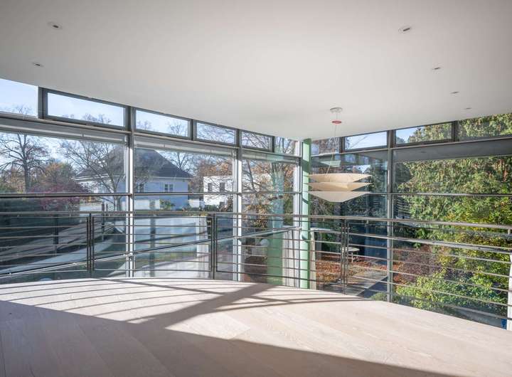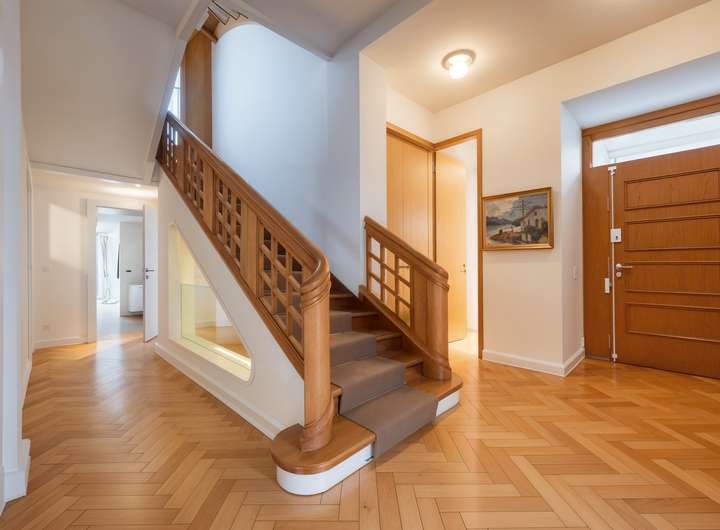 Bereits beim Betreten offenbart sich die besondere Handschrift dieser Immobilie. Der Eingangsbereich beeindruckt mit seiner klaren Linienführung und einem repräsentativen Treppenaufgang, der Tradition und Moderne subtil miteinander verbindet. Helle, hohe Räume, Eichenholzböden und fein abgestimmte Materialien schaffen eine Atmosphäre von Ruhe, Klarheit und Wohnkultur. Die Verbindung zwischen Altbau und Neubau erfolgt über eine lichtdurchflutete Glasgalerie, die durch ihre Offenheit und Transparenz ein besonderes Raumgefühl erzeugt – ein Spiel aus Licht, Perspektive und Architektur. Auf Wunsch lässt sich dieser Verbindungsbereich durch eine Sicherheitstür abschließen oder vollständig trennen, sodass zwei eigenständige Einheiten entstehen.