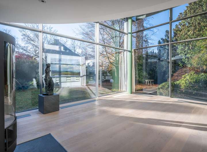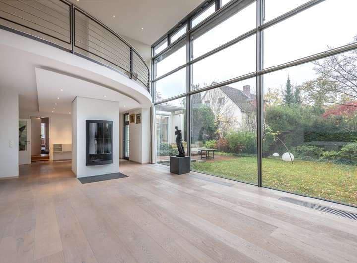 Im historischen Teil des Hauses bildet der großzügige Wohnbereich im Altbau den Mittelpunkt des klassischen Wohnens – mit hohen Decken, warmen Eichenholzböden und einer klaren, ruhigen Raumaufteilung. Hier entsteht ein behagliches Ambiente, das die Geschichte des Hauses spürbar werden lässt und zugleich zeitlose Wohnqualität bietet. Der moderne Wohnraum im gläsernen Neubau setzt dem eine faszinierende architektonische Offenheit entgegen. Raumhohe Glas