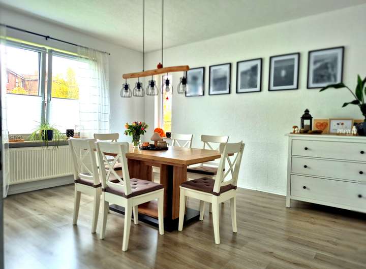 Im Erdgeschoss befinden sich das Wohnzimmer mit dem anschließenden Esszimmer. Der großzügige und lichtdurchflutete Bereich ist ideal für entspannte Stunden im Kreise eurer Familie oder um Gäste zu empfangen.