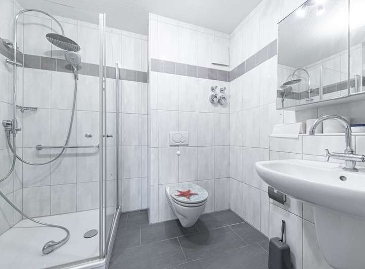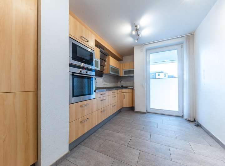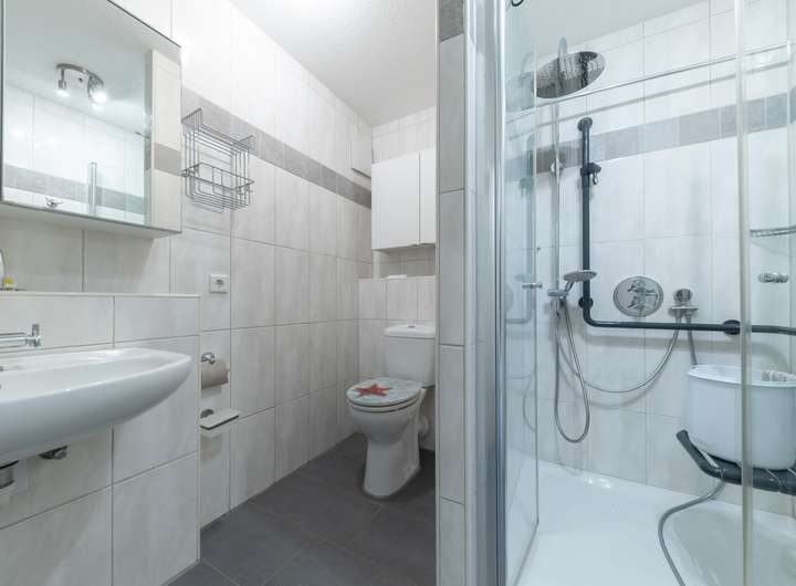 Zwei elegant in Grau-Weiß gestaltete Duschbäder bieten Komfort und Privatsphäre, während die hochwertige Einbauküche mit Buche-Echtholzfronten und edler Granitarbeitsplatte Lust auf gemeinsame Kochmomente macht. Die Fußbodenheizung, elektrischen Rollläden und zusätzlichen Lamellen-Jalousien sorgen für behagliches Wohngefühl und individuelle Lichtstimmungen.