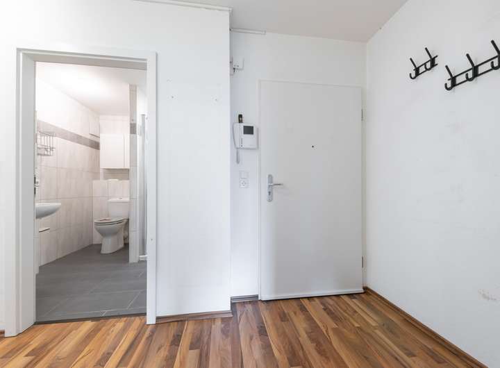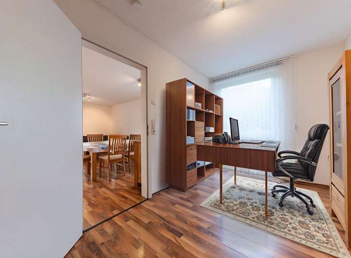 Das Herzstück der Wohnung ist der großzügige Wohn- und Essbereich, der sich nahtlos zur Loggia öffnet und über ein angrenzendes Arbeitszimmer verfügt. Hier versachmelzen drinnen und draußen zu einem besonderen Wohngefühl: Morgens die ersten Sonnenstrahlen auf der Loggia genießen, den Tag mit Blick ins Dorf und das Geschehen beginnen, abends Freunde oder Familie zum Essen einladen und dabei die frische Luft spüren. Strom- und Wasseranschluss auf der Loggia erweitern die Möglichkeiten für Pflanzen, Grill oder ein kleines Balkon-Office und machen sie zu einem echten Erweiterungsraum Ihres Zuhauses.