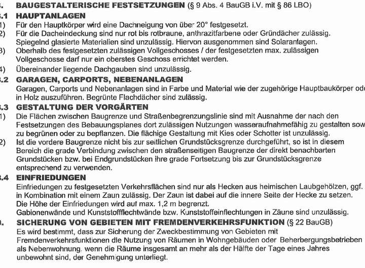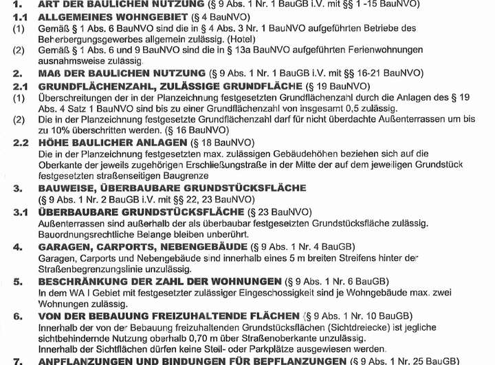 Die Bebauung erlaubt ein Geschoss bei einer Grundflächenzahl (GRZ) von 0,22. Die GRZ kann in bestimmten Bereichen überschritten werden (siehe Teil B: Text). Dies bietet Spielraum für individuelle Planungen und kreative Gestaltung Ihres zukünftigen Hauses.