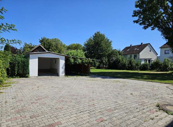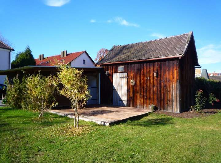 Garage + Carport, Schuppen mit weiterer Terrasse.