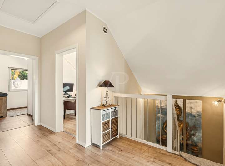 Das Haus ist mit hochwertigen Materialien und modernen technischen Details ausgestattet. Die Fußbodenheizung, betrieben über eine effiziente Wärmepumpe lässt sich komfortabel über einen zentralen Touchscreen im Wohnbereich steuern. Für behagliche Wärme sorgt zusätzlich ein Holzkamin, der eine gemütliche Atmosphäre schafft und zugleich als alternative Wärmequelle dient.