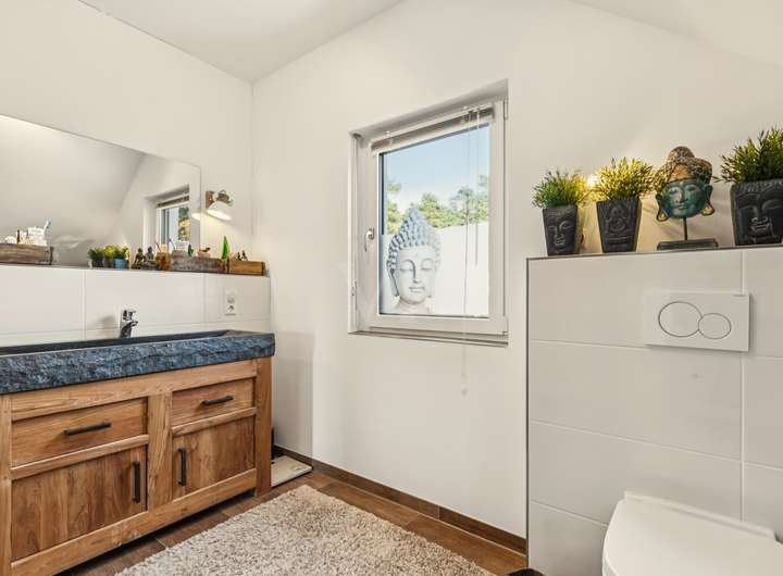 Das stilvolle Badezimmer überzeugt mit einer bodengleichen Dusche, einer Badewanne und einem Waschbecken aus Echtstein, das den hochwertigen Charakter des Hauses unterstreicht.