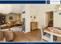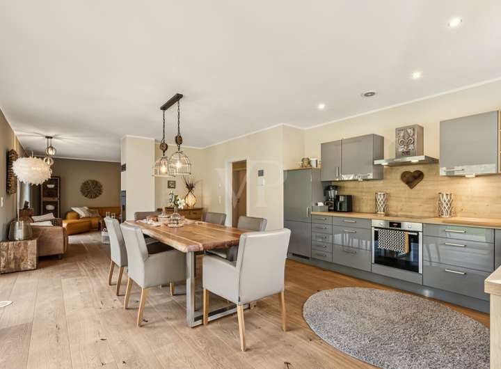 Die moderne Marken-Einbauküche bietet großzügige Arbeitsflächen und fügt sich perfekt in den offenen Wohnraum ein. Die Böden sind teilweise in edlem Echtholz ausgeführt und verleihen den Räumen eine natürliche, warme Ausstrahlung.