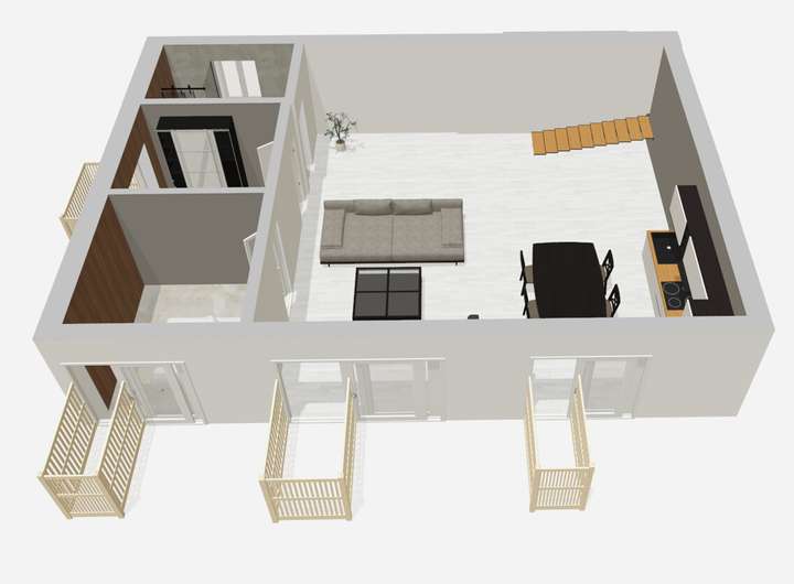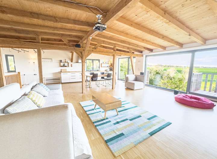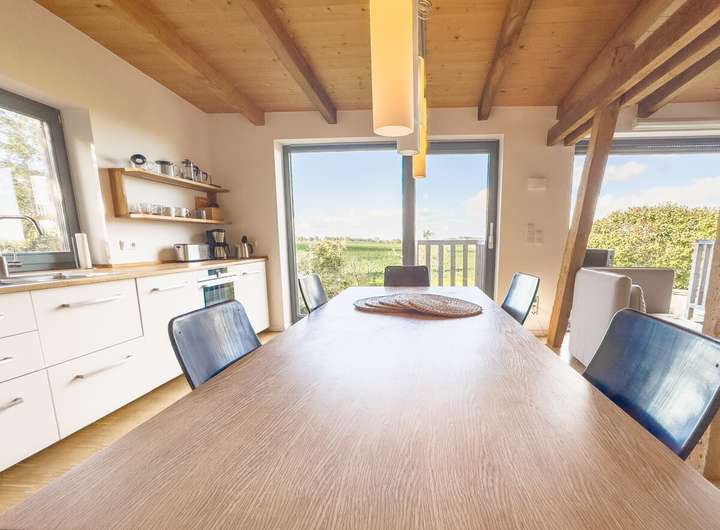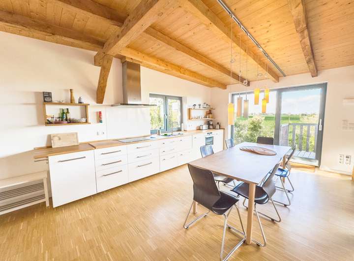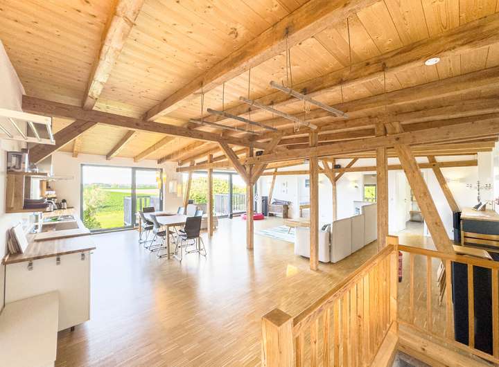 // Offener, heller Wohn- und Essbereich mit sichtbarem Gebälk