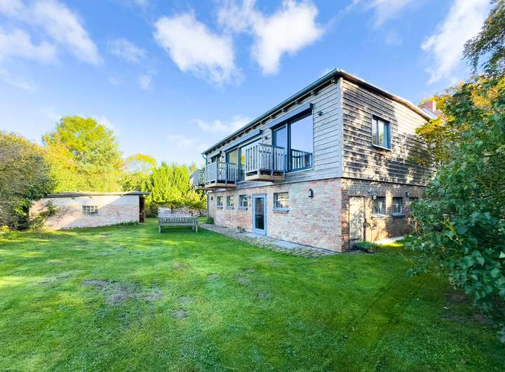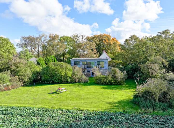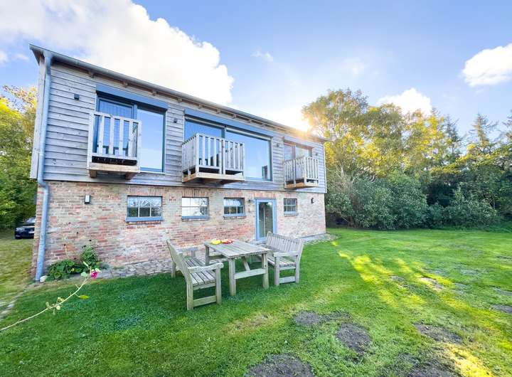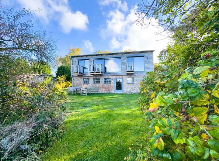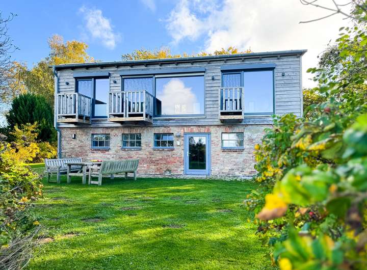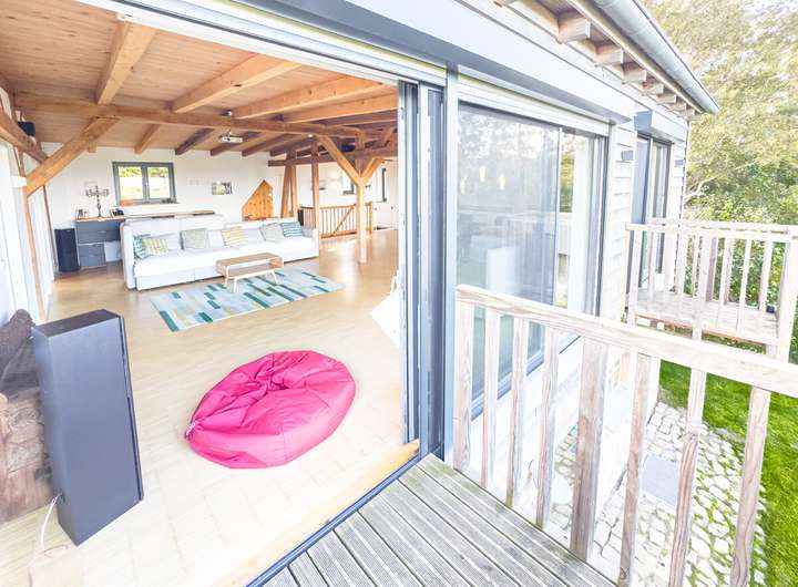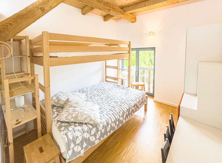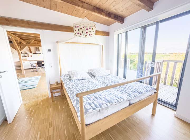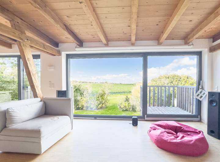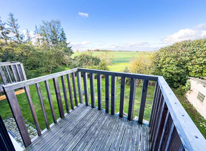 Die obere, zweite Einheit öffnet sich mit einem hellen, offenen Wohnbereich, in dem das ursprüngliche Tragwerk sichtbar bleibt. Die klare Architektur, die durchdachte Raumaufteilung und der Ausblick über Felder und Landschaft verleihen dieser Etage eine besondere Leichtigkeit. 2 Schlafzimmer und ein modernes Bad ergänzen hier das Raumangebot. Drei Balkone auf dieser Ebene und die Terrasse im Erdgeschoss schaffen die Verbindung nach draußen, in den weitläufigen, 2.901 m² großen Garten. Der alte Baumbestand bietet Sichtschutz und eine natürliche Einrahmung.