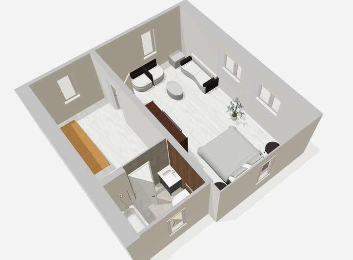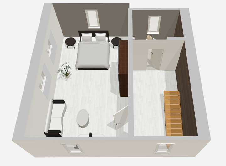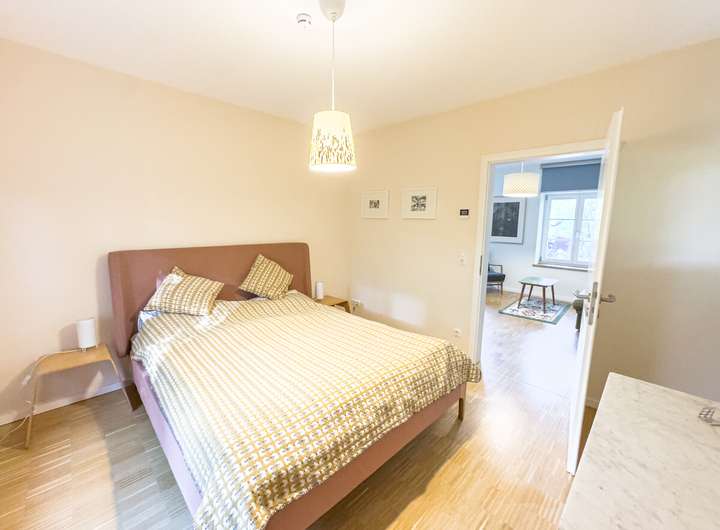 // Mosaikparkett im Wohn- und Schlafbereich