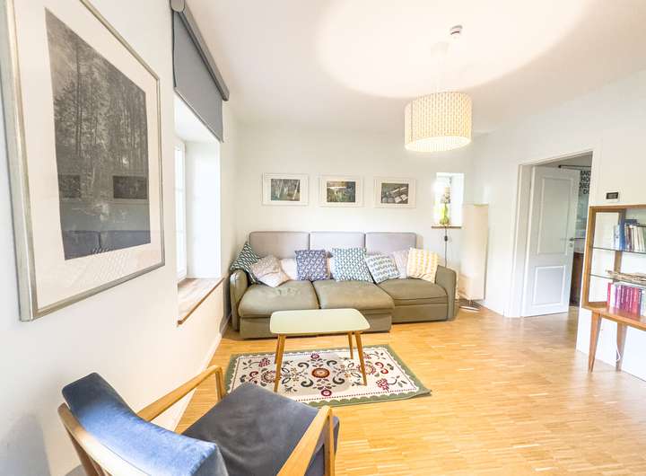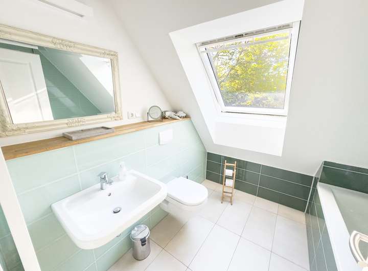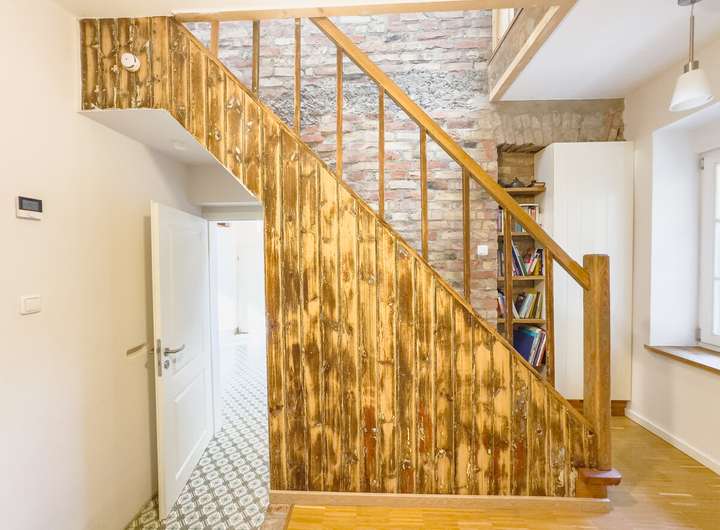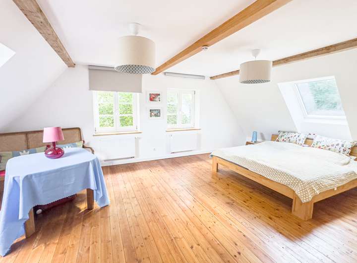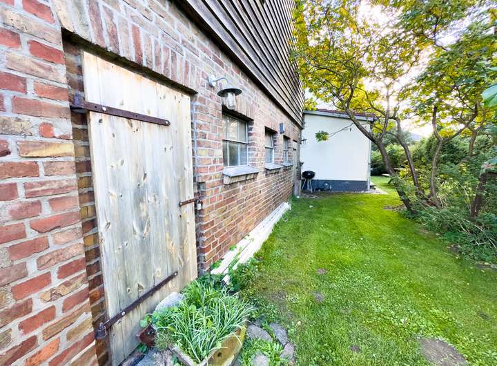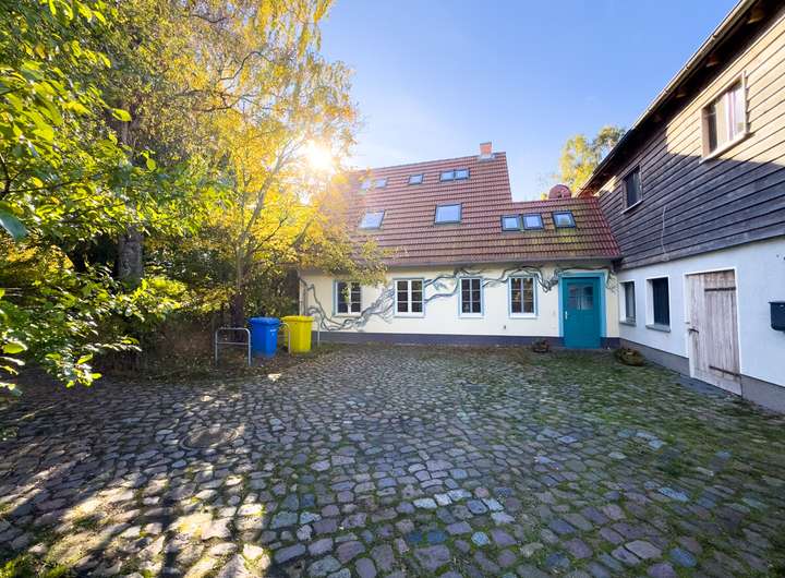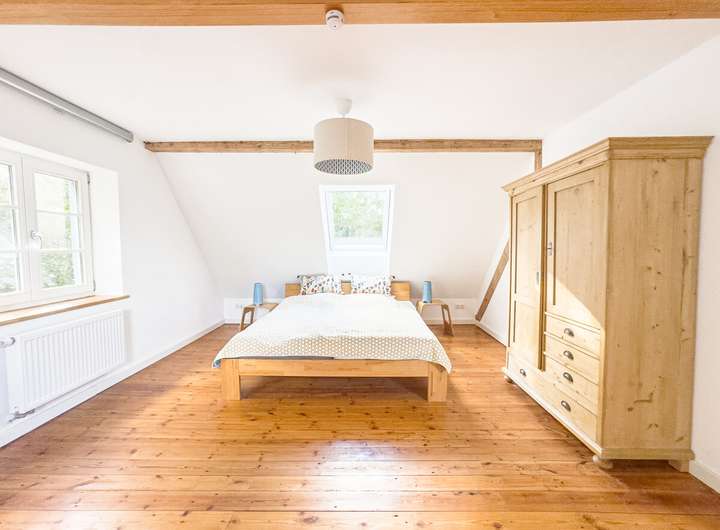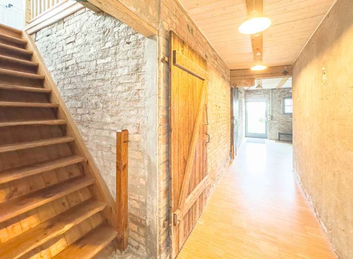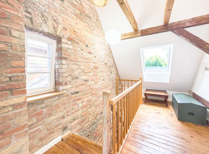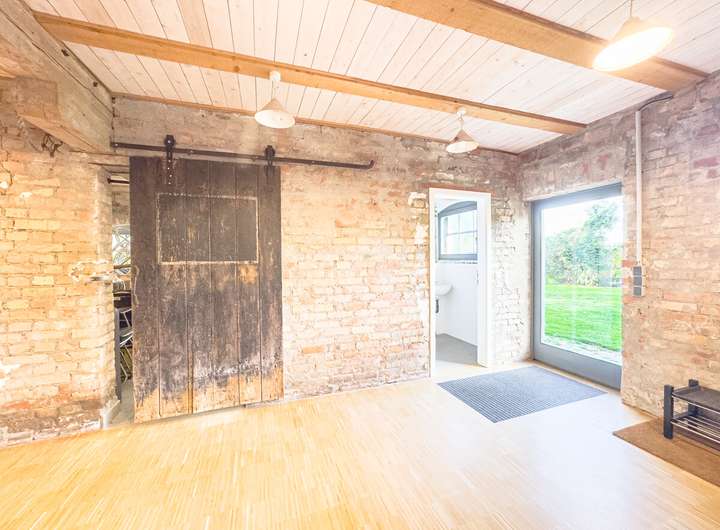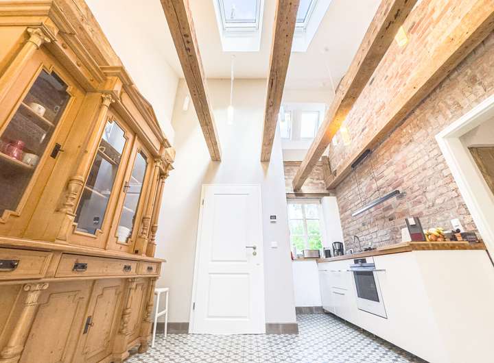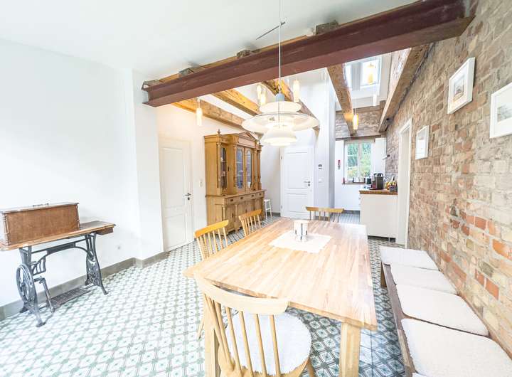 In der ersten Einheit empfängt eine großzügige Küche mit eindrucksvoller Raumhöhe, Oberlichtern und dem stimmigen Zusammenspiel aus Backstein, Holz und modernen Elementen. Daran schließen sich ein gemütliches Wohnzimmer, ein Schlafzimmer und ein großer, aktuell als Gemeinschaftsraum genutzter Bereich an. Eine Treppe führt hinauf in den kleinen Spitzboden, der als Galerie ausgebaut wurde – ein ruhiger Rückzugsort mit besonderer Atmosphäre. Auf derselben Ebene befinden sich außerdem ein Hauswirtschaftsraum, ein Fahrradkeller sowie der ehemalige Stall, der sich ideal als Fitnessbereich anbietet; Anschlüsse für Sauna und Dusche sind bereits vorbereitet.