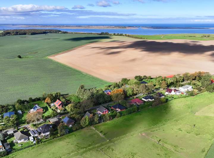 Das Dorf selbst ist geprägt von gepflegten Einfamilienhäusern, Feldern und weiten Sichtachsen bis hin zum Wasser. Hier öffnet sich der Blick über die Landschaft, der Bodden liegt in greifbarer Nähe, der Naturstrand von Klausdorf ist in wenigen Minuten (ca. 3 km) erreicht. Das nahe Schloss Hohendorf verleiht der Umgebung eine besondere Note und unterstreicht den historischen Charme der Region.