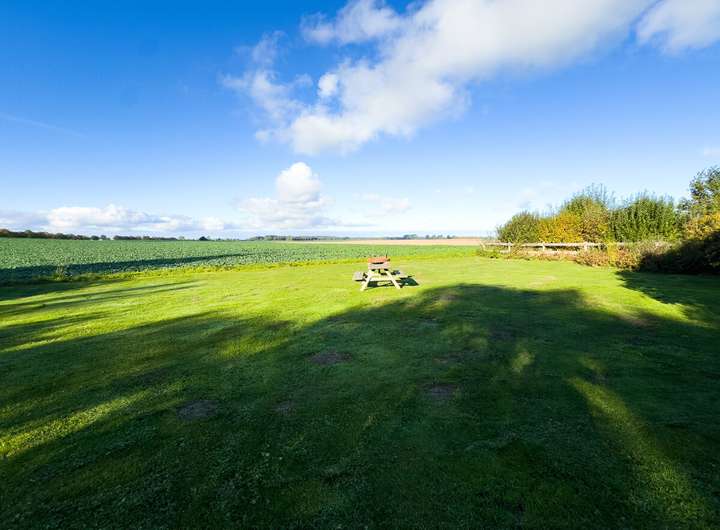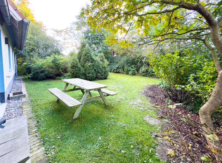 // Garten mit Blick über Felder bis zum Wasser