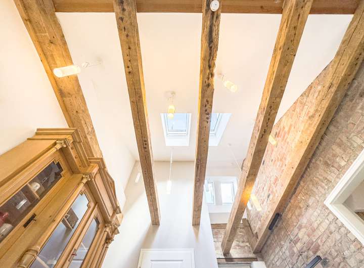 // Großzügige Raumhöhe mit Oberlichtern und sichtbarem Gebälk