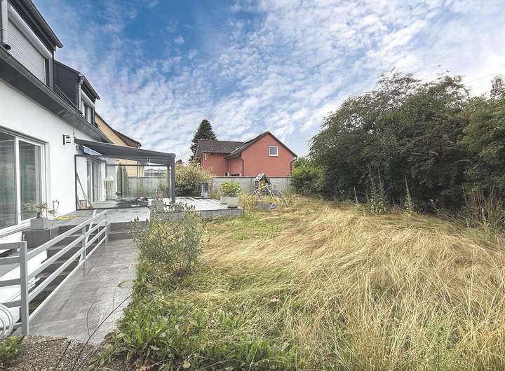 Wohnen im Grünen: Großer Garten und eine Terrasse, die sich komplett durch Glasschiebeelemente schließen lässt