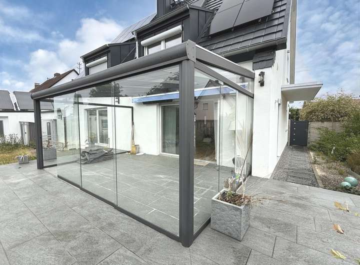 Terrasse komplett verschließbar durch Glasschiebeelemente