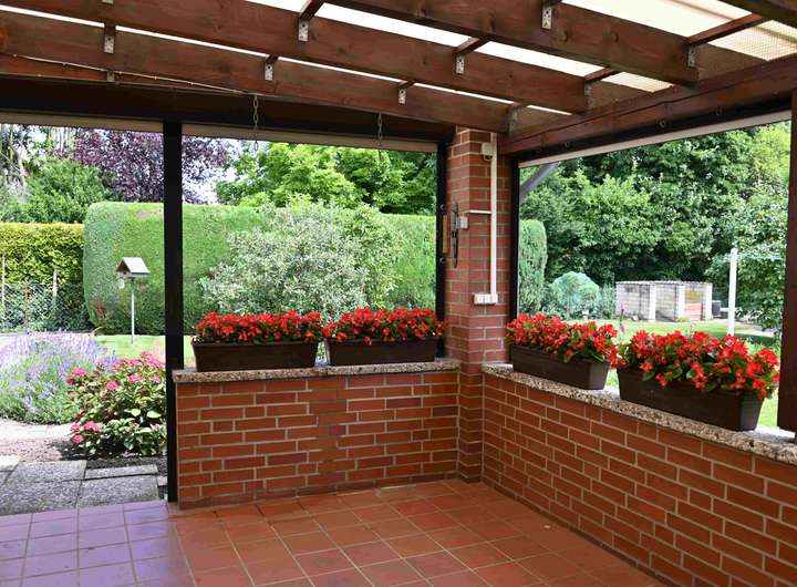 Im Garten befinden sich ein gemauertes Gartenhaus mit Stromanschluss sowie ein überdachter Freisitz, der mit elektrischen Außenjalousien verschlossen werden kann. Dieser steht direkt hinter der großen Garage. Der Garten kann mit Wasser aus einen Brunnen, der auf dem Grundstück ist bewässert werden.