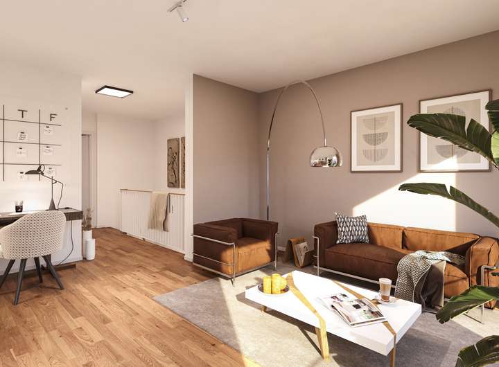 The semi-detached house will be fitted with oak real wood parquet flooring, underfloor heating, timeless wall coverings and porcelain stoneware tiles. With an energy-efficient heat supply and their own photovoltaic system, the houses also impress on an ecological level.