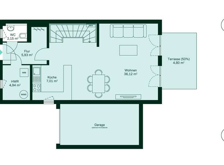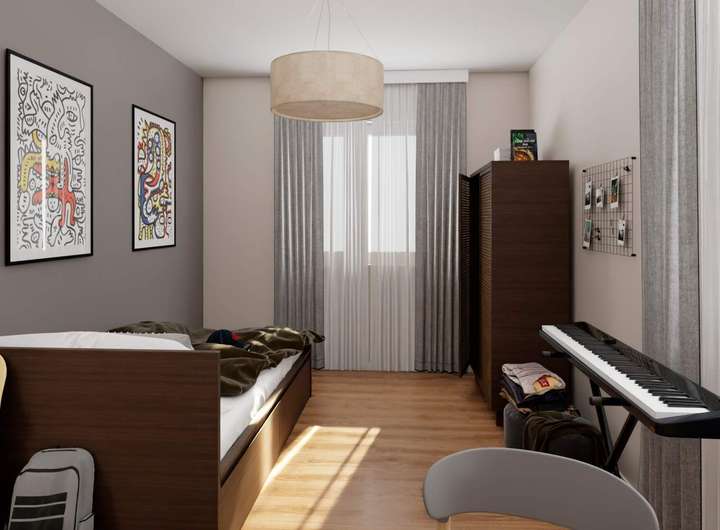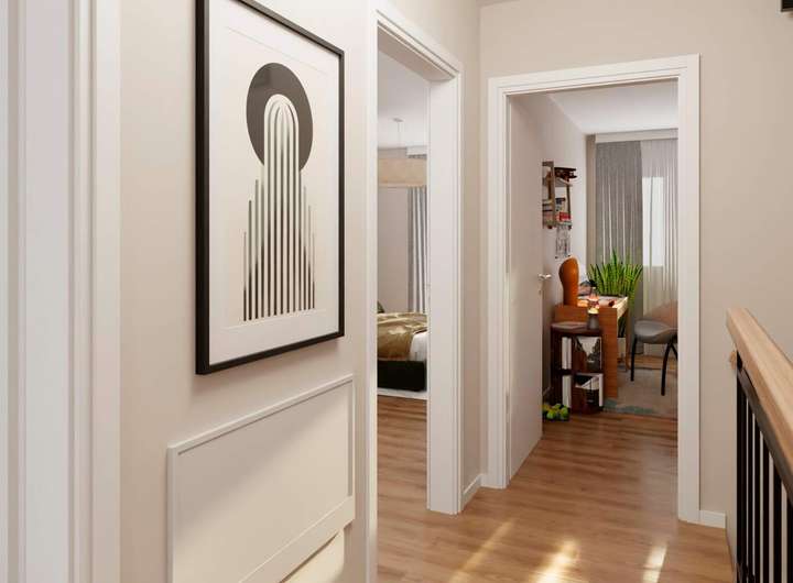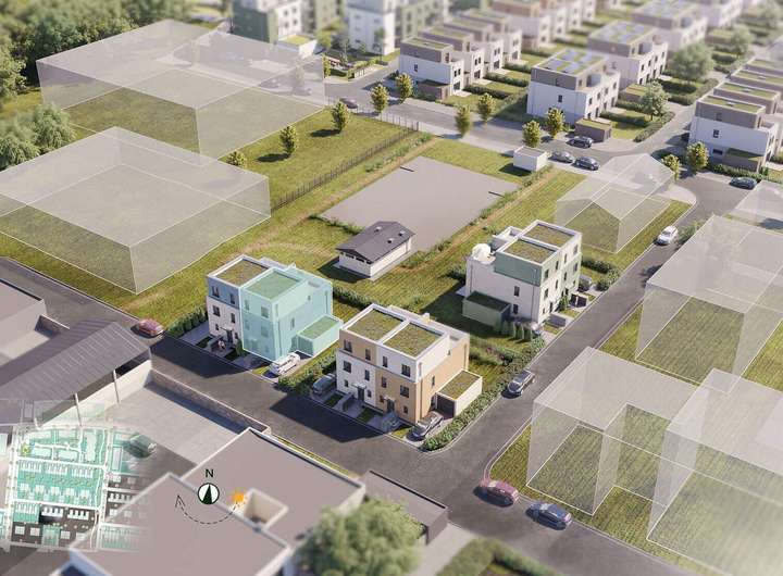 Beim Betreten des Erdgeschosses Ihres neuen Zuhauses empfängt Sie ein einladender Wohnbereich, der mit einer offenen Küche verbunden ist. Die Terrasse bietet zusätzlichen Raum für gemütliche Stunden im Freien. Praktische Räume wie ein Hauswirtschaftsraum und ein Gäste-WC sind ebenfalls vorhanden. Im Obergeschoss finden Sie das geräumige Schlafzimmer mit Ankleide und zwei Kinderzimmer. Das Badezimmer bietet sowohl Dusche als auch Badewanne. Die Dachterrasse ist ein Highlight für entspannte Stunden und bietet viel Platz zum Entspannen.