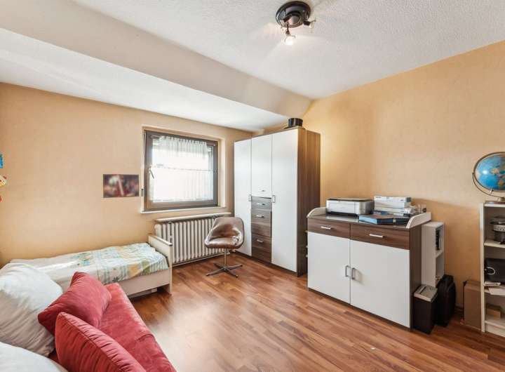 Im Obergeschoss stehen Ihnen ein Schlafzimmer sowie ein Kinderzimmer zur Verfügung. Auf der Halbetage befindet sich ein Gäste-WC.