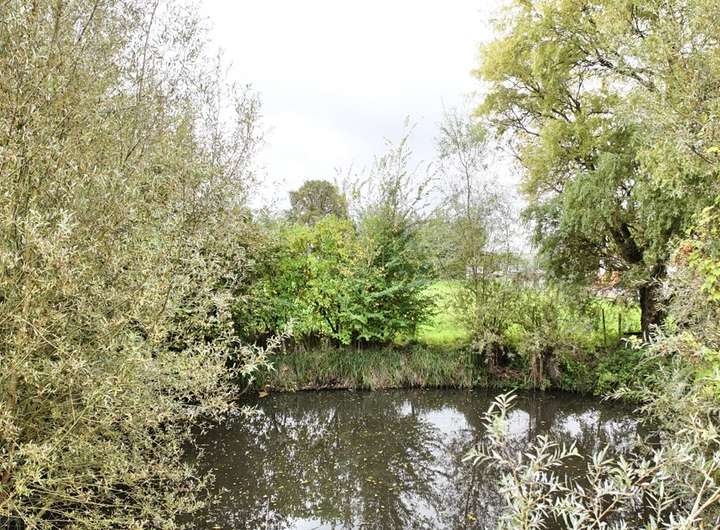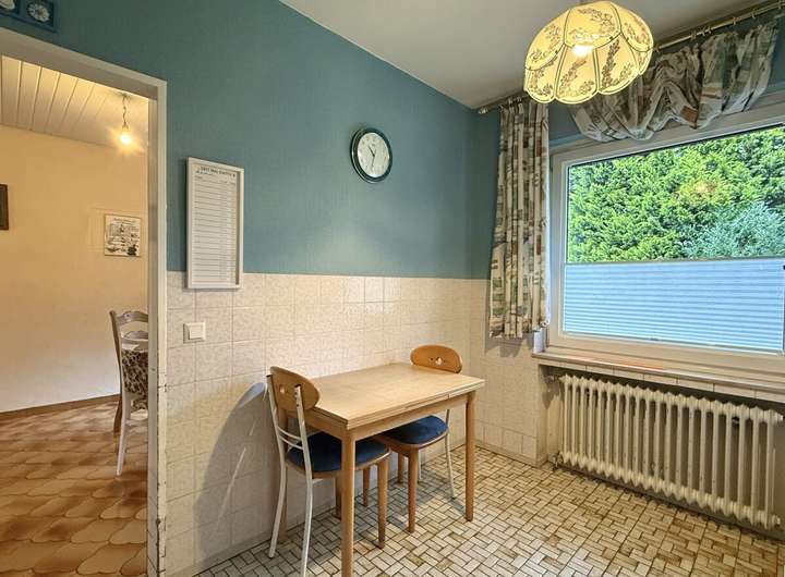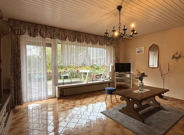 Im Erdgeschoss auf ca. 100 m² Wohnfläche befinden sich ein großzügiger Wohn-/Essbereich mit angrenzender Küche, zwei Kinderzimmer, ein Elternschlafzimmer, ein Badezimmer mit Dusche, ein Gäste-WC, ein Abstellraum. Über das Wohn-/Esszimmer gelangen Sie auf die Terrasse mit großem Garten und Teich, die nach Süden ausgerichtet ist.