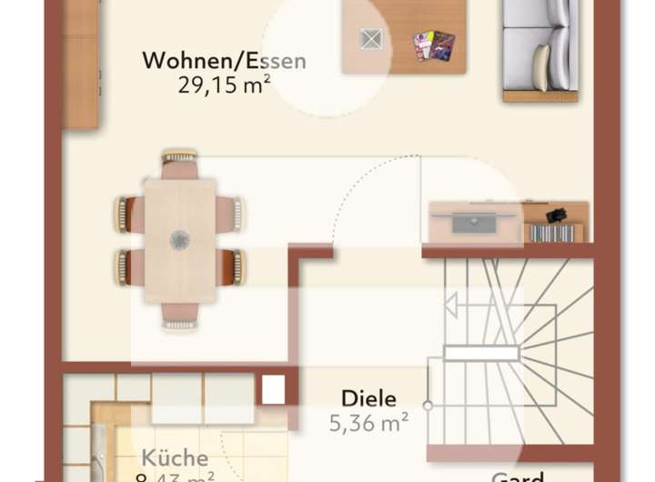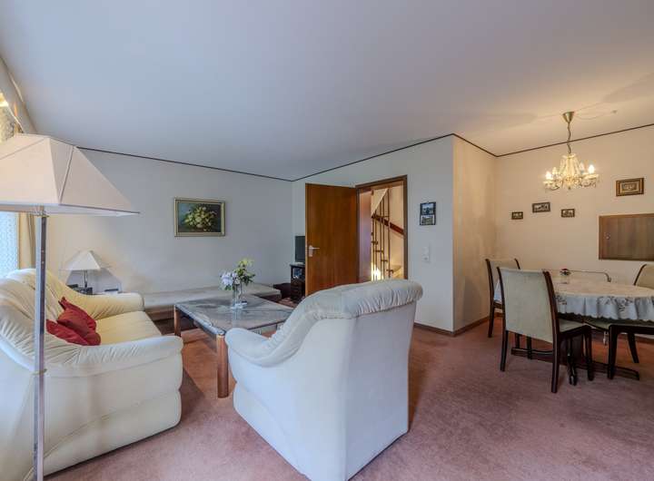 Im Erdgeschoss erwartet Sie ein großzügiger Wohn- und Essbereich mit direktem Zugang zum eigenen Garten – ideal für gemütliche Stunden im Freien oder gesellige Grillabende. Die separate Küche ist funktional geschnitten und bietet viel Raum für Ihre persönliche Gestaltung.