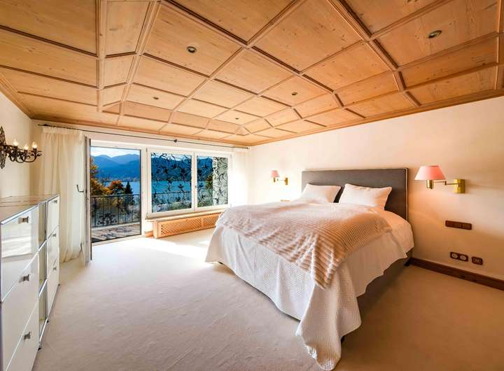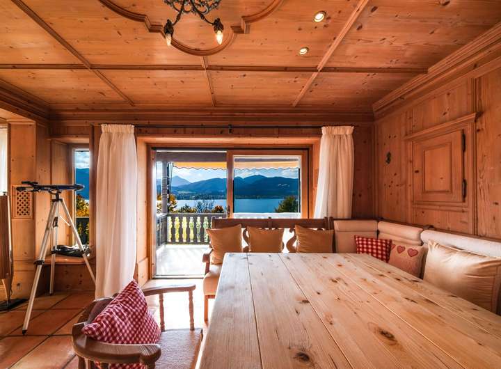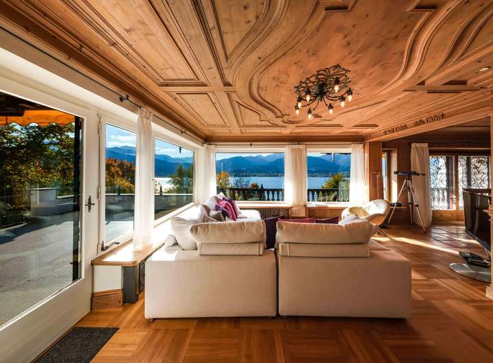 Die Wohnung überzeugt durch ihren ortstypischen, traditionellen Stil mit hochwertigen Holzarbeiten, Parkett-, Fliesen- und Teppichböden. Großzügige Fensterfronten eröffnen beeindruckende Ausblicke auf den Tegernsee und die umliegende Bergwelt.