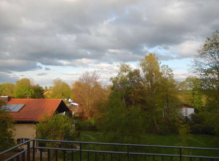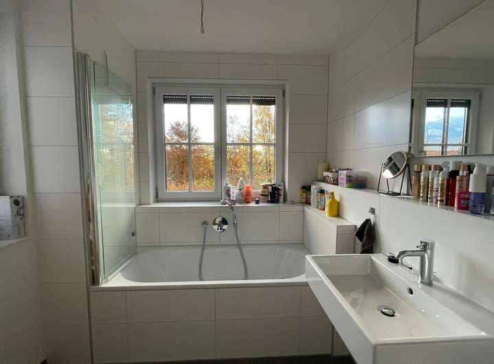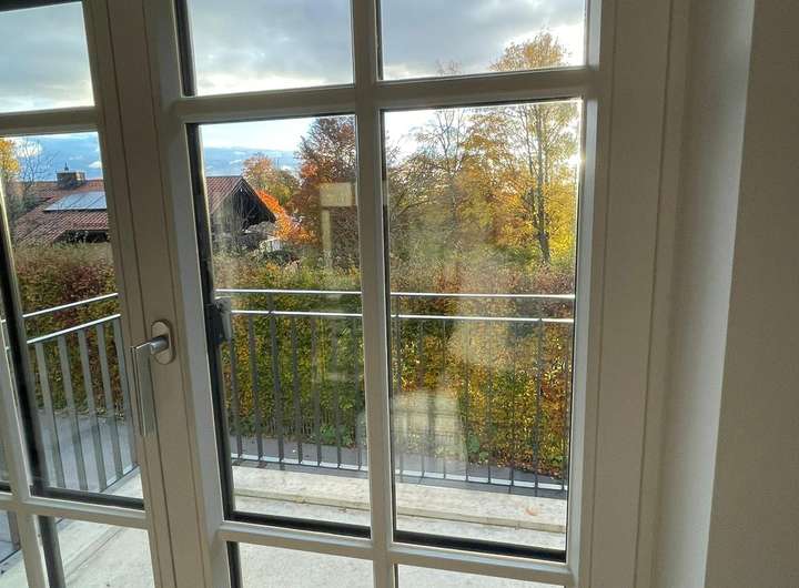 Dank der **leichten Hanglage** genießen Sie einen wunderbaren **Blick ins Voralpenland**. Da die Straße tiefer liegt, bietet der Garten zudem **viel Privatsphäre** – niemand geht auf Augenhöhe vorbei.