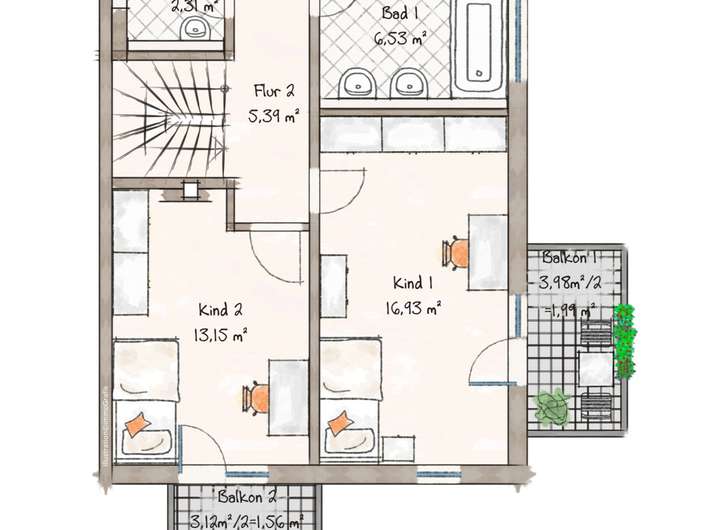 Das **Obergeschoss** bietet zwei helle **Kinderzimmer**, jeweils mit **Balkon**, sowie ein **Tageslichtbad mit Badewanne**.