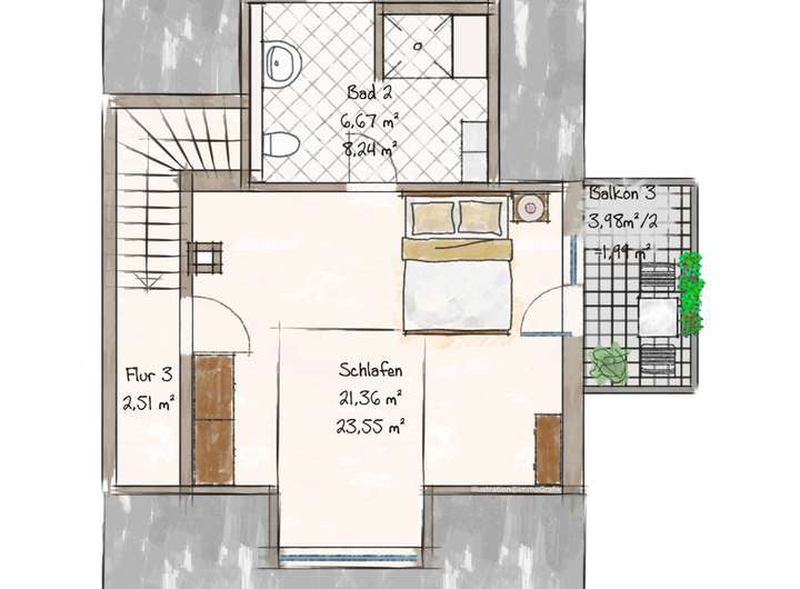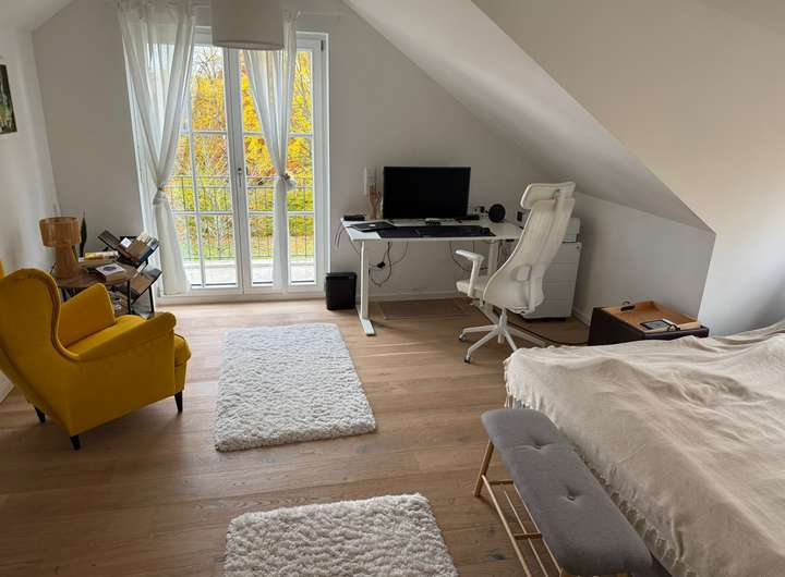 Im **Dachgeschoss** befindet sich ein sonniges **Studio** mit **Tageslicht-Duschbad** und einem weiteren **Balkon**.
