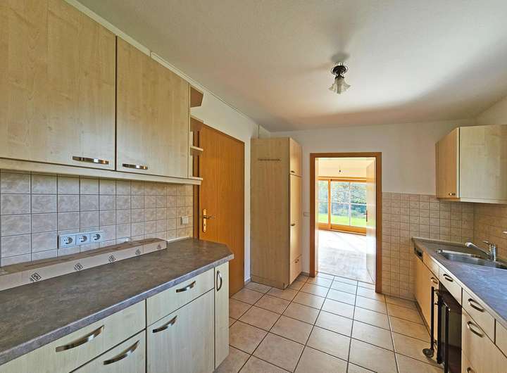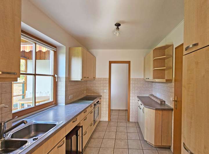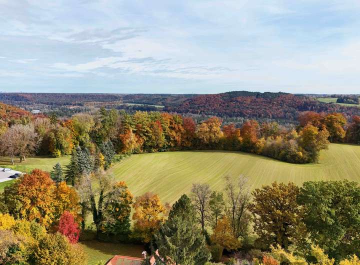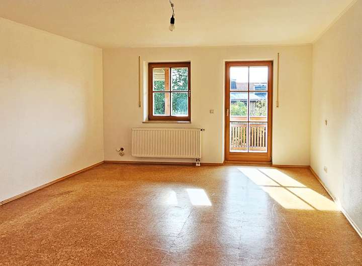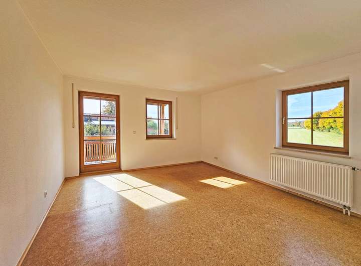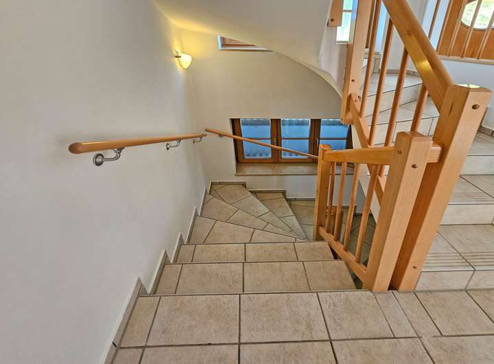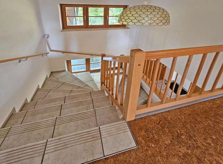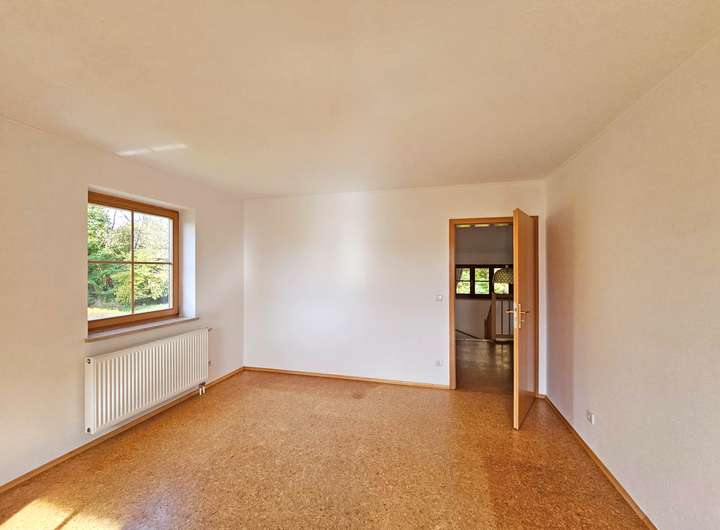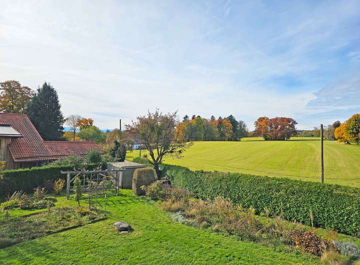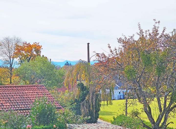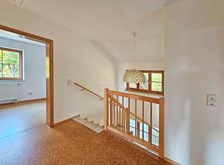 Über ein lichtdurchflutetes Treppenhaus gelangt man in das geräumige Obergeschoss mit drei Zimmern, wovon zwei den Zugang auf den Südbalkon gewähren. Der Ausblick vom Balkon über Wiesen und Alleen bis in die Berge ist unerreicht.