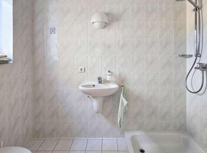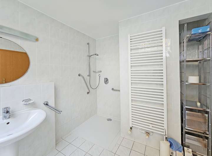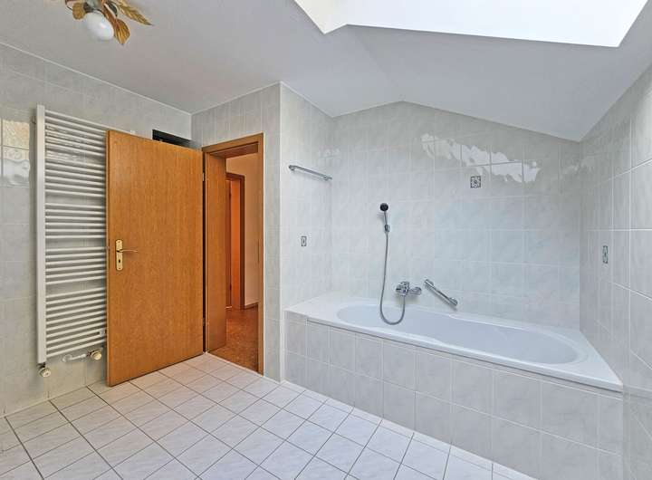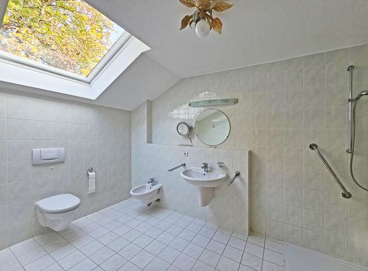 Ebenfalls im Obergeschoss befindet sich ein großes Wannenbad mit Dusche, WC und Bidet. Dieses Bad verfügt über ein großes zu öffnendes Dachfenster mit Fernbedienung und Fußbodenheizung.