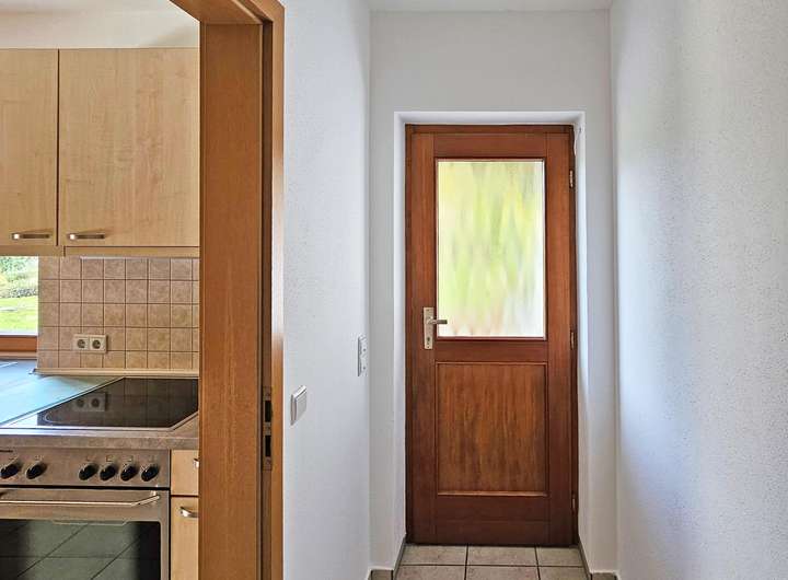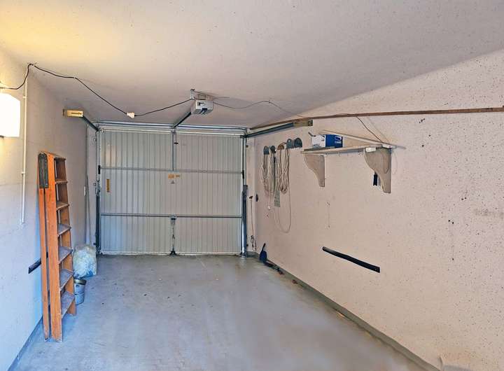 Neben dem Hauseingang befindet sich angebaut eine große Garage mit darüberliegendem Stauraum. Auf der gemeinsamen Hoffläche kann ein KFZ geparkt werden.