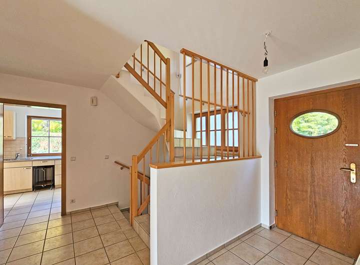 Der Baukörper wurde in Massivbauweise errichtet mit Erdgeschoss, Keller und Obergeschoss. Der Speicher bietet großen Stauraum und wird über eine Dachbodenleiter erreicht. Die gesamte DHH befindet sich einem sehr guten und gepflegten Zustand und kann daher ohne Renovierung sofort bezogen werden. Auf einer Wohnfläche von ca. 143 qm und einer Nutzfläche von ca. 202 qm sowie einem Grundstück von ca. 952 qm lassen sich mannigfaltige Wohnträume realisieren. Die durchdachte Raumaufteilung und die angenehme Atmosphäre machen dieses Haus zu einem besonderen Ort, an dem Sie sich sofort wohlfühlen werden. Der großzügige Wohn-Essbereich mit seinem Kaminofenanschluss und den über ca. 44 qm Wohnfläche bietet ein Ambiente mit viel Licht und einem angenehmen Raumgefühl. Durch das geschickte Raumkonzept befindet sich im EG ebenfalls eine geräumige Küche mit angrenzender Speisekammer, mit Außentüre auf die Südwestterrasse, sowie ein Duschbad mit WC.