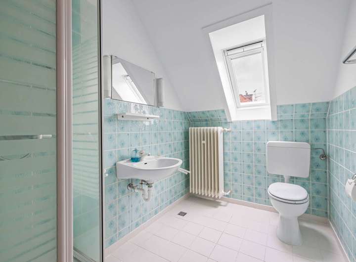 Das Obergeschoss bietet drei weitere Schlafzimmer und ein zweites Badezimmer in Mintgrün, ausgestattet mit Dusche, Waschbecken und WC – praktisch und charmant zugleich.