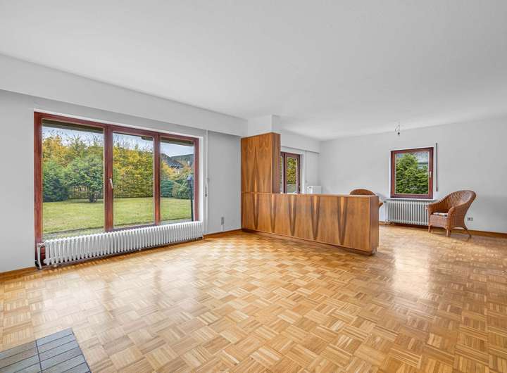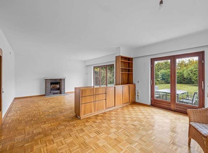 Im Erdgeschoss befinden sich ein großzügiges Wohn- und Esszimmer mit Parkettboden sowie ein Kamin. Der Kamin ist noch vorhanden und prägt den Raum mit seiner klassischen Ausstrahlung; allerdings entspricht er heute nicht mehr den aktuellen Vorschriften und kann daher nicht betrieben werden.