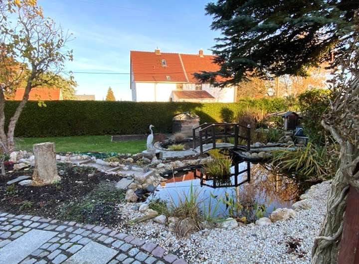 Das große, gepflegte Grundstück ist ein echtes Highlight: Es umfasst eine Doppelgarage, eine Werkstatt bzw. einen Schuppen, ein Gewächshaus sowie einen idyllischen Gartenteich (ca. 1800l) – ideal für Gartenfreunde und alle, die Ruhe und Erholung im Grünen suchen.