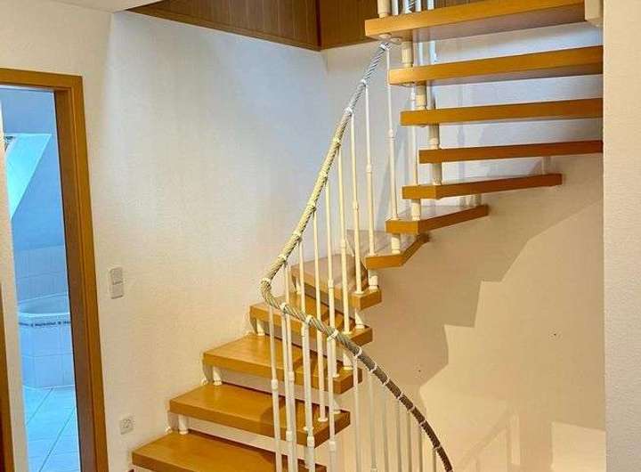 Über eine stilvolle Wendeltreppe gelangen Sie in das 1. Obergeschoss, das drei gut geschnittene Zimmer – ideal als Schlaf-, Kinder- oder Arbeitszimmer – sowie ein helles Tageslichtbad mit Badewanne und WC bietet.