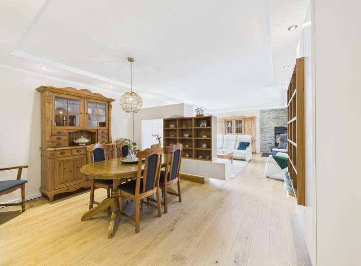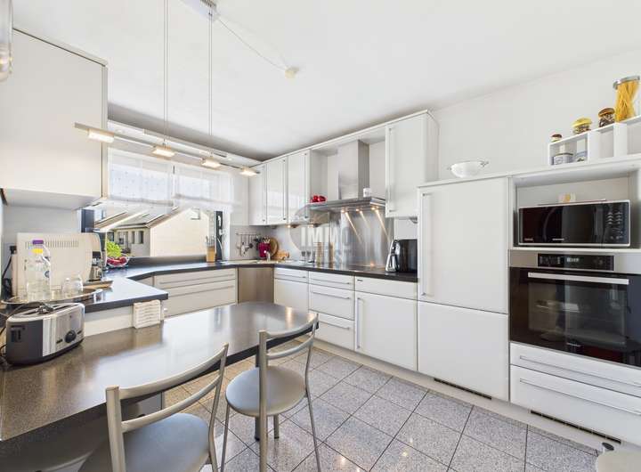 Die stilvolle Einbauküche erfüllt höchste Ansprüche und lädt zu geselligen Kochabenden ein. An kühleren Tagen sorgt ein gemütlicher Kamin für wohlige Wärme und eine behagliche Atmosphäre. Der Zugang zu einer Sonnenterrasse und einem einladenden Balkon bietet zusätzliche Rückzugsorte für entspannte Stunden im Freien.
