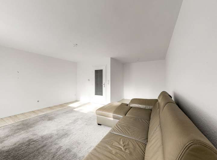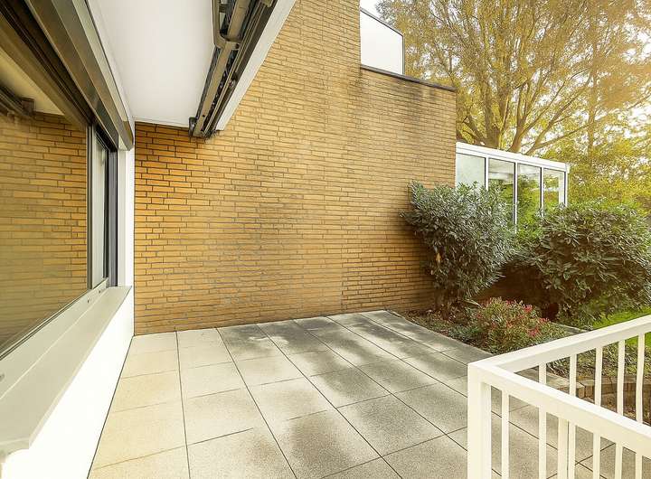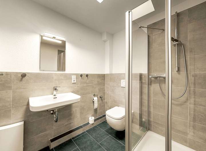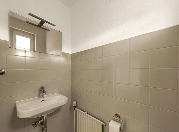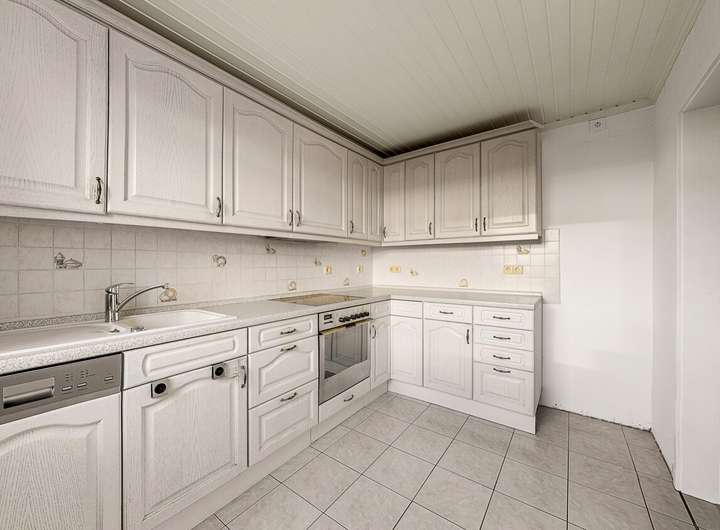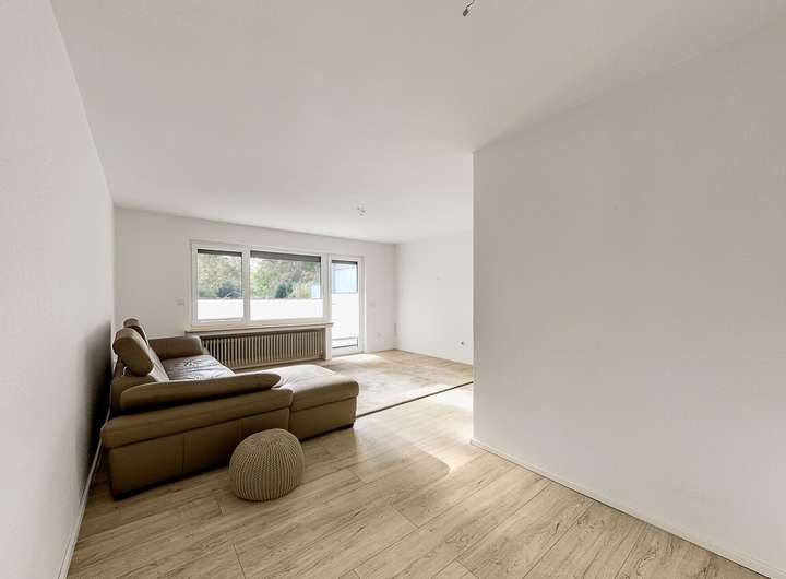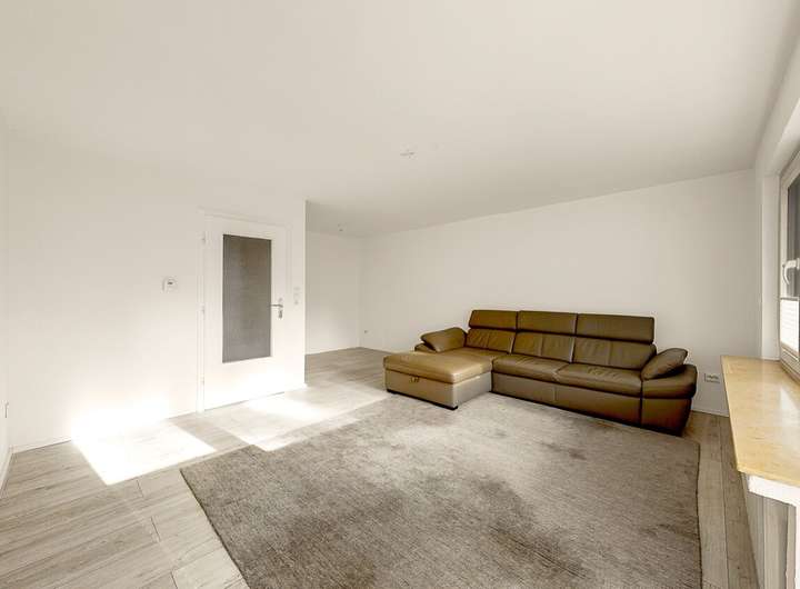Im Erdgeschoss befinden sich eine Küche mit Einbaugeräten sowie ein Wohnbereich mit Zugang zur Terrasse und in den Garten. Eine elektrische Somfy-Markise sorgt hier für angenehmen Sonnen- und Wetterschutz. Die Bodenbeläge wurden in zwei Etappen erneuert: Zunächst wurde 2021 neues Laminat verlegt, 2023 folgte im Flur die Erneuerung des Teppichbodens. Das Gäste-WC erhielt 2021 zunächst ein neues Fenster und wurde 2023 vollständig modernisiert.
