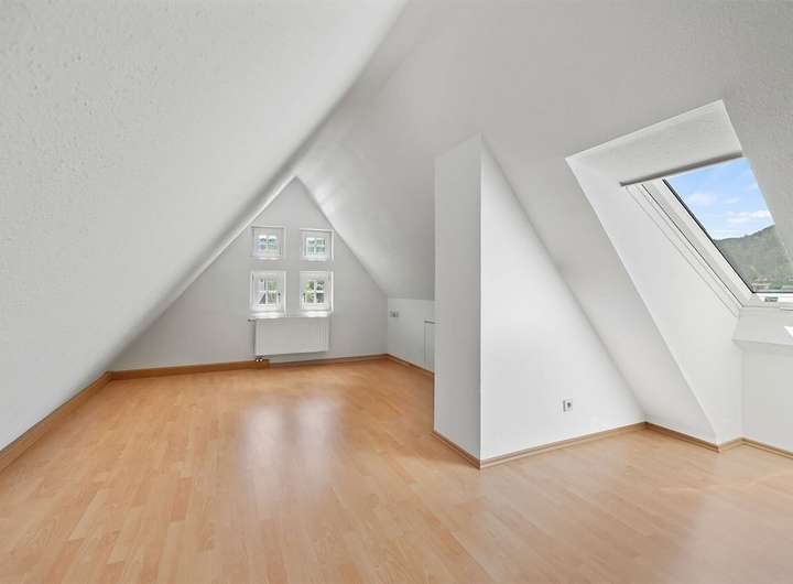 Die Wohnung wurde ursprünglich als 2-Zimmer-Wohnung geplant. Zur Wohnfläche von ca. 58 m² gibt es noch eine zusätzliche Nutzfläche im Dachspitz mit einer schönen Höhe, in der man wunderbar den Nachthimmel betrachten kann.