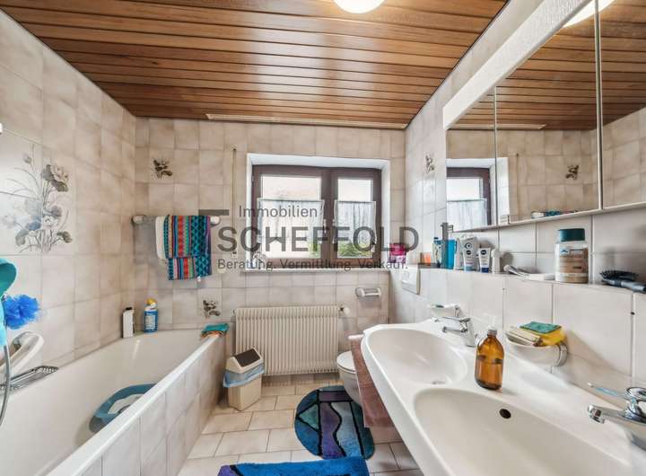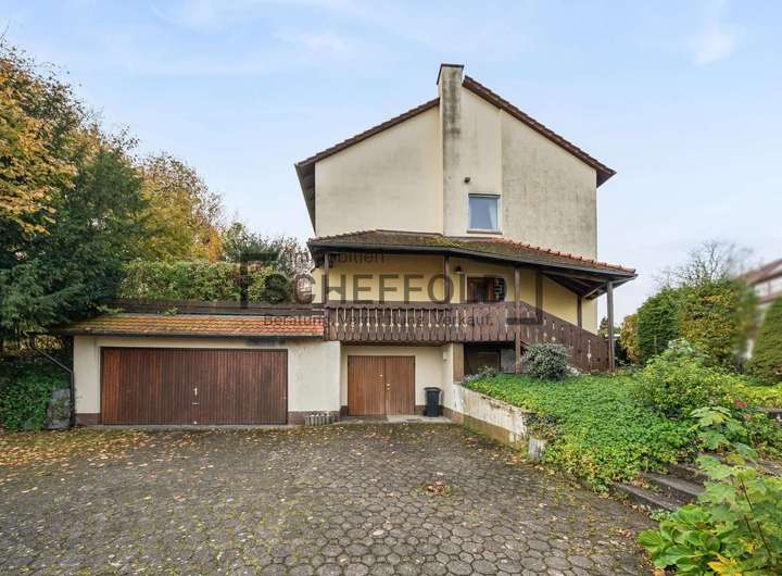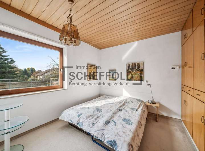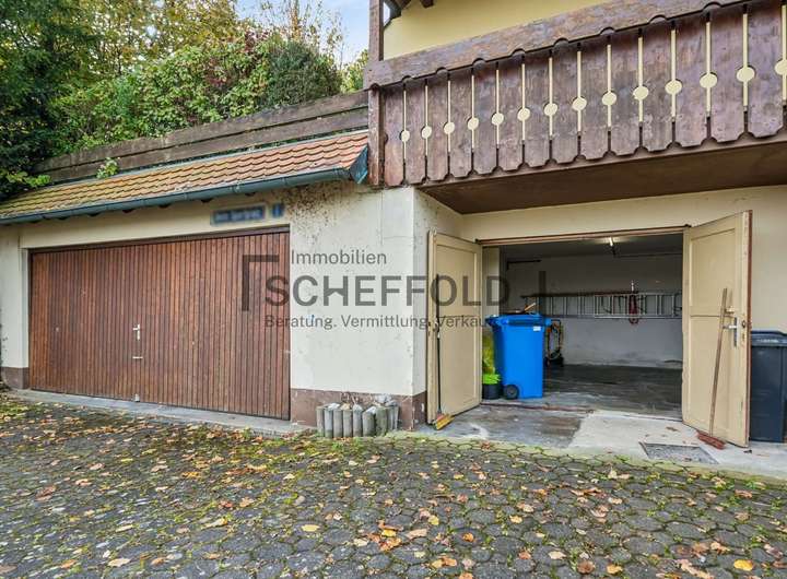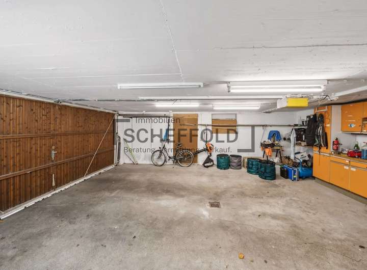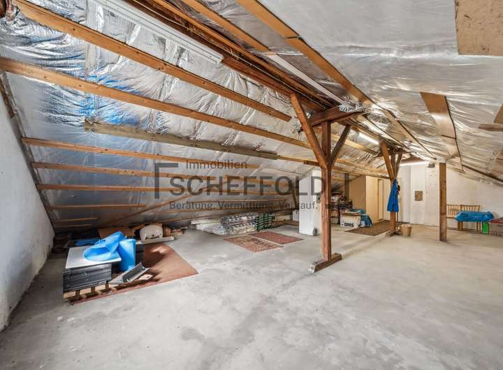 Das Haus verfügt außerdem über ein geräumiges Dachgeschoss mit großem Lagerraum sowie über einen Keller mit funktionalen Nebenräumen. Hier befinden sich ein Waschraum, der Heizungsraum mit Zugang zum Öllager, ein zusätzlicher Abstellraum sowie ein Bereich mit Dusche und WC – ideal für Gäste oder als praktische Lösung nach der Gartenarbeit. Dank der Hanglage gelangen Sie vom Keller direkt auf den Hof, wo mehrere Stellplätze zur Verfügung stehen. Eine Einzelgarage mit Durchgang zur Doppelgarage sorgt für ausreichend Platz für Fahrzeuge und Werkstattbedarf.